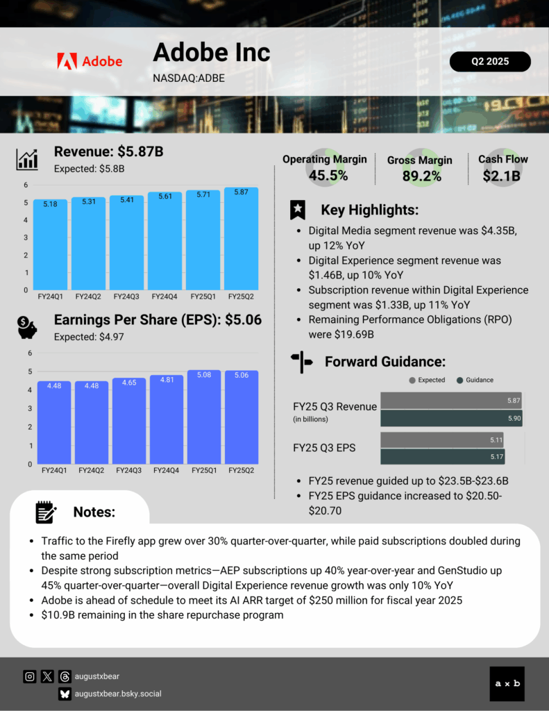 Adobe Inc (NASDAQ:ADBE) delivered better-than-expected results for FY25 Q2, but the beats were minimal—just over 1% for both revenue and EPS. Management also raised full-year guidance, yet again only modestly, with both revenue and EPS bumped by roughly 1% (if that), failing to generate real excitement.