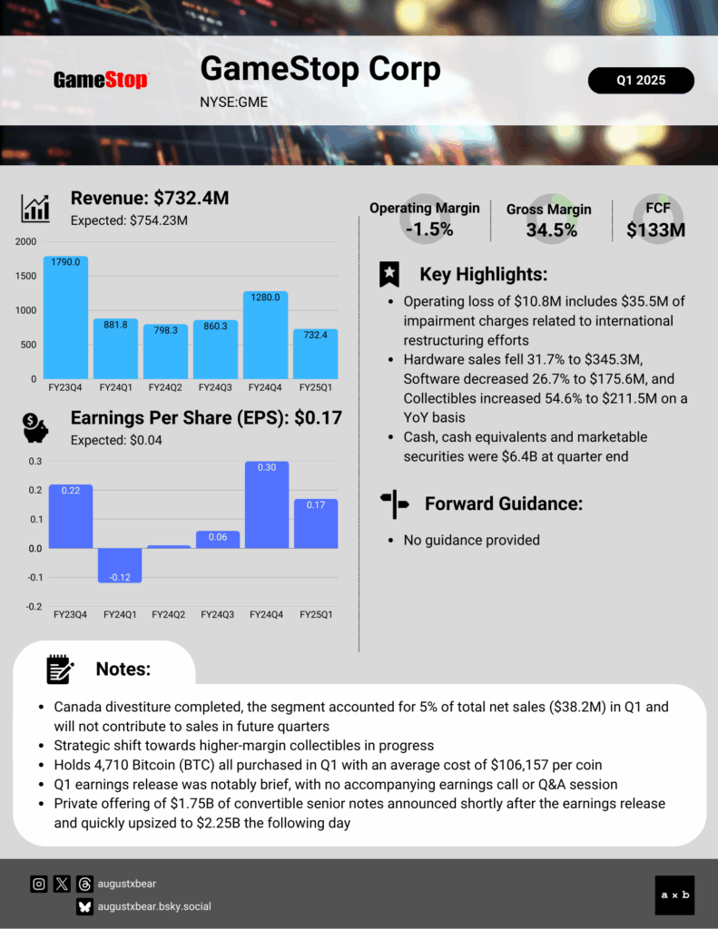 GameStop Corp. (NYSE:GME) delivered a mixed FY25 Q1 report that, while initially underwhelming, revealed some encouraging signs beneath the surface. Headline numbers disappointed, with sales missing expectations and a reported operating loss. Year-over-year sales comparisons were weak, and the absence of an earnings call or detailed presentation further clouded the picture.