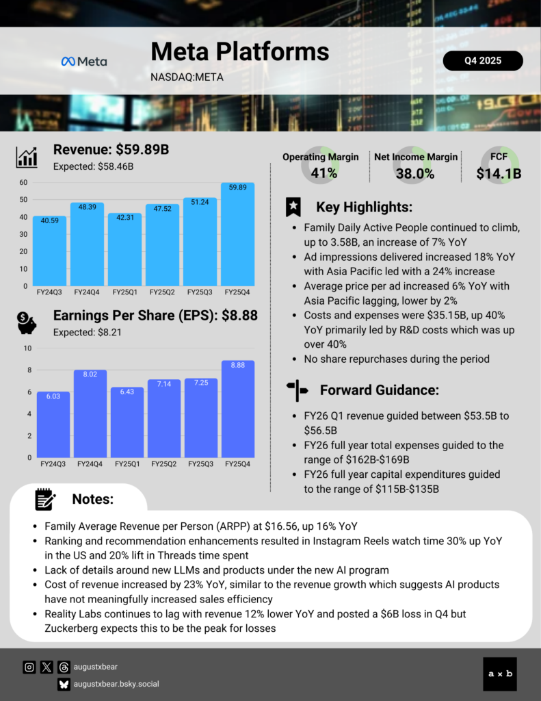 Meta Platforms (NASDAQ:META) closed out 2025 with a strong Q4, beating revenue expectations by more than 2% and EPS by 8%. User growth continues with Family Daily Active People now reaching 3.58 billion across its platforms. While the Asia Pacific region leads in growth rate, a shifting regional mix contributed to a slight drag on pricing.