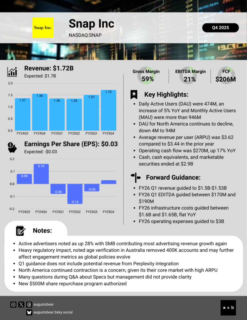 Snap Inc (NASDAQ:SNAP) delivered a quarter of mixed progress, beating analyst expectations on revenue and posting a surprise positive net income of $45 million. Total revenue grew 10% year-over-year to $1.72 billion, a notable improvement from the stagnation seen in previous years. Average Revenue Per User (ARPU) also topped forecasts at $3.62. However, despite these improving financial metrics, the underlying numbers were far from spectacular.