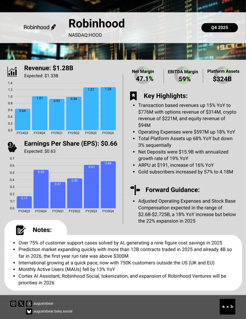 Robinhood Markets (NASDAQ:HOOD) reported mixed results for Q4 2025, beating earnings expectations but missing on revenue due to a significant slowdown in the crypto market. Total revenue rose 27% year-over-year to $1.28 billion, which fell short of the $1.33 billion consensus. Despite the revenue miss, the company posted record diluted EPS of $0.66, exceeding the $0.63 analyst estimate. While the expected rate of growth in 2026 expenses is 18%, down from the 25% growth seen in 2025, the projected total of over $2.6 billion weighs on investors. Another area of concern was the 13% year-over-year drop in monthly active users, which fell to 13 million as retail engagement cooled.