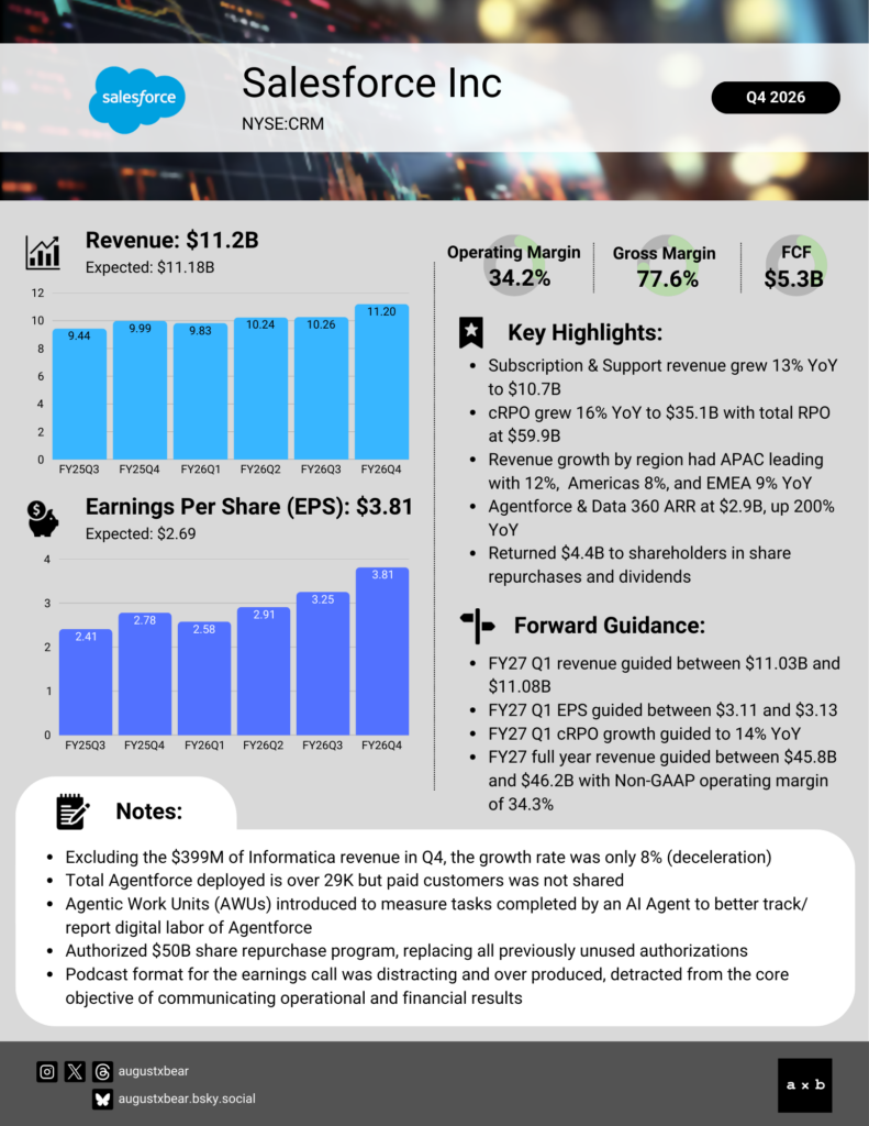 The podcast-style call leaned more toward production value and vision than detailed operational disclosure, emphasizing AI positioning and customer stories while offering less granular insight into demand trends. Management also introduced Agentforce Work Units (AWUs) as a new way to measure and monetize AI agent consumption across the platform. Conceptually, AWUs shift pricing from traditional seat-based models toward usage-based AI productivity metrics. The leadership team also announced a new $50 billion share repurchase authorization which includes prior unused allocations and will be partially financed by debt.
