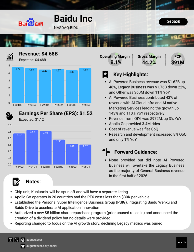 Baidu Inc (NASDAQ:BIDU) posted a mixed FY25 Q4. The Chinese company delivered $4.68 billion in revenue, which met market expectations, while earnings beat analyst estimates. However, the operating margin for Baidu General Business compressed to 9.1%, a sharp drop from the 15% seen last year. This contraction highlights the high costs of the AI pivot, further evidenced by a full-year negative free cash flow of $1.15 billion.
