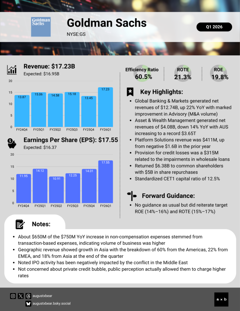 Goldman Sachs (NYSE:GS) reported a strong Q1 2026, beating on both revenue and EPS. Net revenues of $17.23 billion topped estimates of $16.95 billion, and diluted EPS of $17.55 cleared the $16.37 consensus, marking the second-highest quarterly revenue and EPS in firm history.