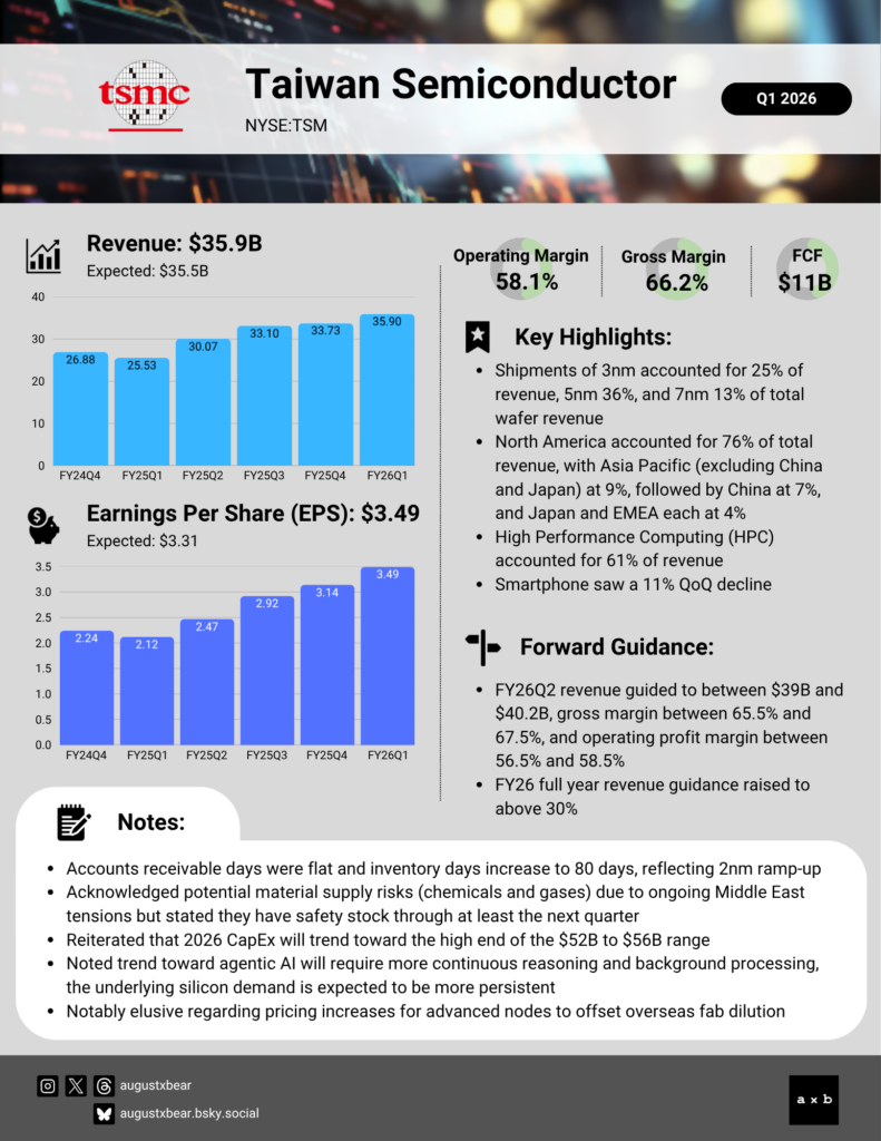 Taiwan Semiconductor Manufacturing Corp (NYSE:TSM) beat on both revenue and EPS in Q1 2026, with gross margin of 66.2% coming in well above the 63-65% guidance range and marking a record for the company. The print extended TSMC’s streak to eight consecutive quarters of double-digit profit growth, and management raised full-year revenue growth guidance from approximately 30% to above 30% while moving CapEx to the high end of the $52-$56 billion range.